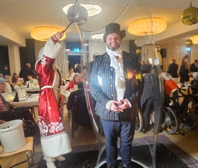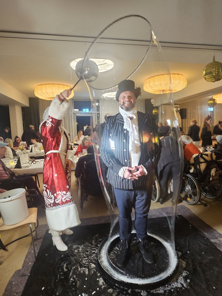 Mit festlich geschmückten Cüpli-Gläsern wurden die Gäste von der Geschäftsleitung am Eingang des Saals empfangen. Und gleich beim Eintritt erwartete sie eine spannende Willkommensüberraschung: Die Seifenblasenkünstlerin Galina Chernik, weihnachtlich gekleidet in einem besonderen St. Petersburger Gewand, umhüllte die Teilnehmenden in eine menschengrosse Seifenblase und brachte somit zahlreiche Augen zum Leuchten. Im gedämpften Licht liess Galina ihre Seifenblasen steigen und verwandelte somit den Raum in einen magischen Ort festlicher Gemütlichkeit. Für die musikalische Unterhaltung sorgte von Anfang an das Duo Pablito mit David, Piero und Karl. Mit Pop-Klassikern wie mit modernen Charthits sicherten die drei Musiker die gelassene und zugleich heitere Stimmung während des gesamten Abends.