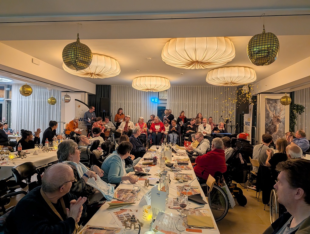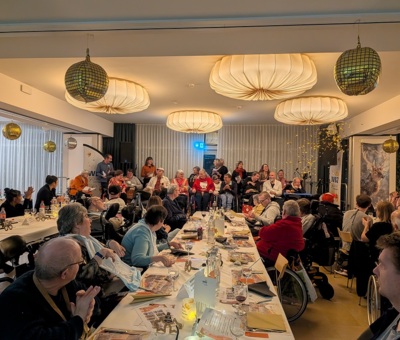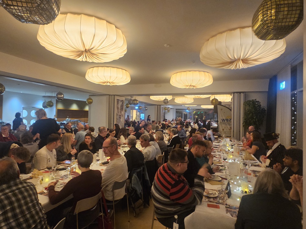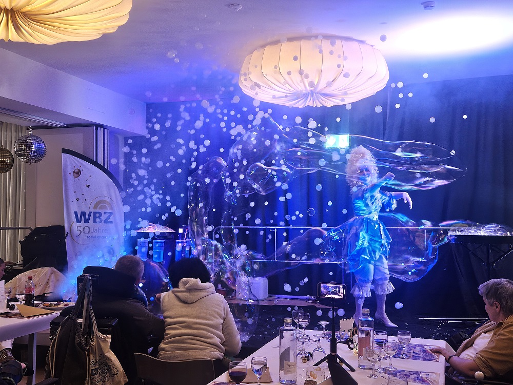Am 12. Dezember fand die traditionelle Jahresabschlussfeier im WBZ statt – dieses Mal im Rahmen des Jubiläums mit feierlichen Höhepunkten, um dieses aussergewöhnliche Jahr auf besondere Weise abzuschliessen. Die Rekordzahl an Teilnehmenden beweist, dass es Bewohnenden und Mitarbeitenden sehr wichtig war, diesen Abend gemeinsam zu verbringen und den Zusammenhalt zu zelebrieren. Hervorragendes Essen mit festlicher Geburtstagstorte, unterhaltsame Shows und ein einmaliger Auftritt des WBZ-Chores gehörten zu den Pointen des Abends. So verabschiedete das WBZ mit Musik, Magie und vielen Emotionen seinen Meilenstein «50 Jahre sozial engagiert».