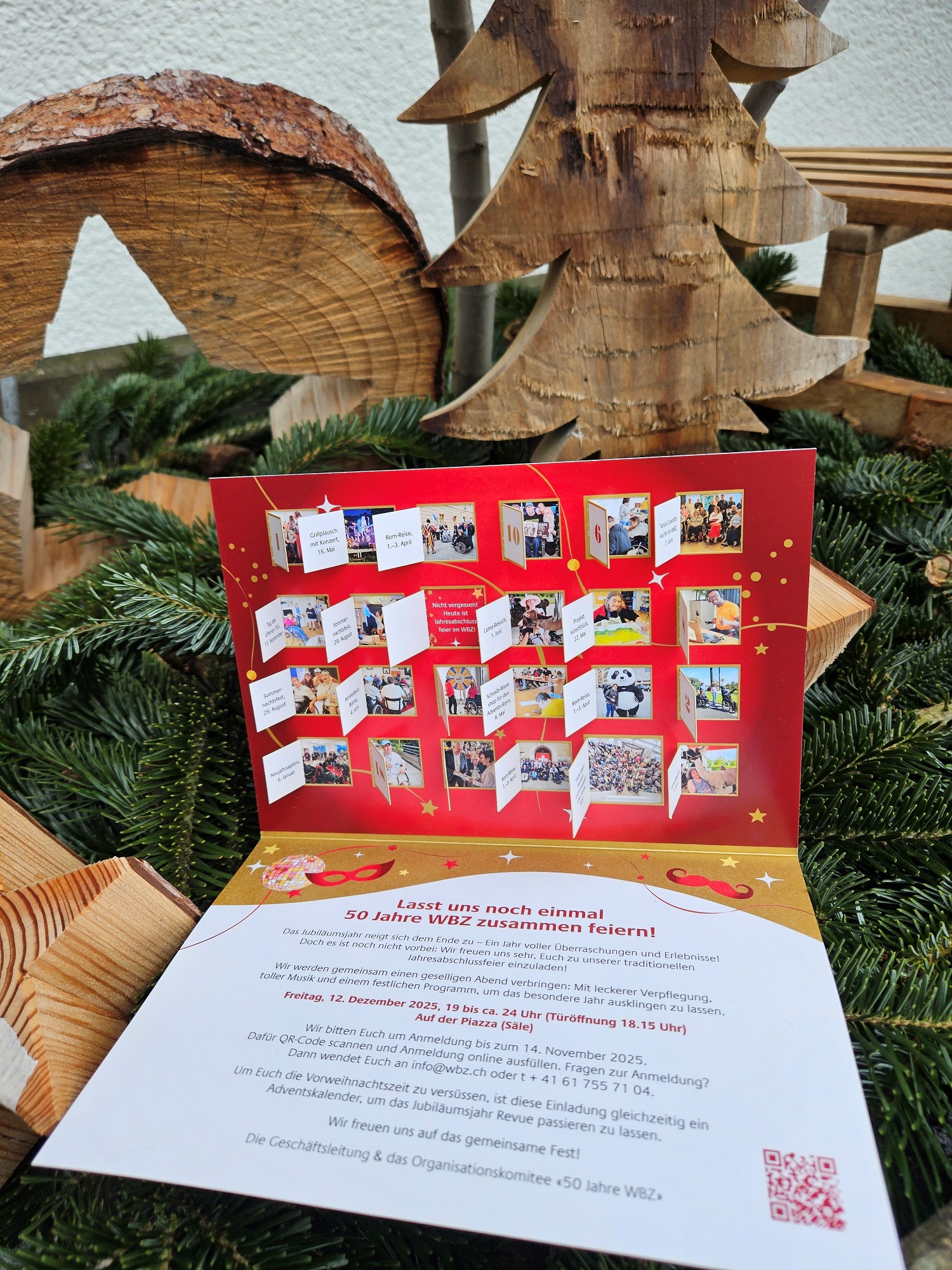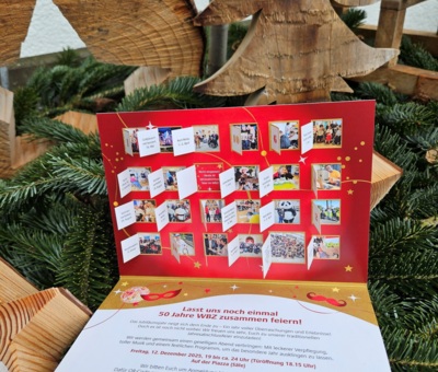 Ein letztes Mal wurde ein besonderer Jubiläums-Anlass mit einer im Haus gestalteten, originellen Karte beworben. Die Gestaltung der Karte entstand wieder aus den kreativen Ideen des Grafischen Service-Zentrums und wurde von Menschen mit Behinderung mitgestaltet und in Kuverts gebracht. Für die Jahresabschlussfeier war die Einladungskarte gleichzeitig ein Adventskalender mit 24 Türchen, die Tag für Tag in der Adventszeit Bilder rund um die Ereignisse im Jubiläumsjahr entfalteten. Dies zeigt einmal mehr die Kompetenz und Vielseitigkeit der WBZ-Dienstleistungen und hat einen weiteren Auftrag an Menschen mit Behinderung generiert. (lpe)