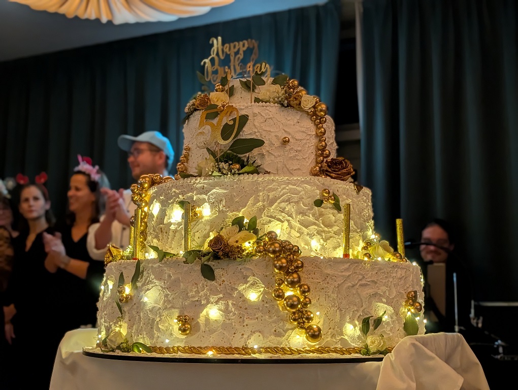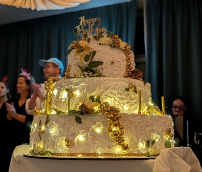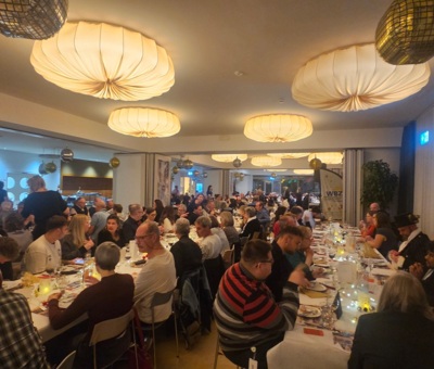 Die Gastronomie des WBZ wuchs einmal mehr über sich hinaus und zauberte für den Abend ein fantastisches Menü auf die Teller. Auf der Karte standen: Terrine auf Waldorfsalat mit Apfel-Chutney, am Stück gebratenes Rindsfilet oder gegrillter Kräuterseitling als Vegi-Variante, angerichtet auf luftigem Champagner-Kartoffelstock mit bunter Gemüsegarnitur. Zwei erlesene Weine rundeten das Abendessen ab. Zu späterer Stunde kam dann die grosse Surprise: Das Küchenpersonal betrat den Saal mit einer riesigen und hübsch geschmückten Geburtstagstorte und die Musiker spielten und sangen dabei «Happy Birthday». Was für ein tosender, glückseliger Moment!