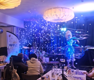 Die Hauptshow der Künstlerin war ein Zusammenspiel aus Licht, Farbe, Musik und Bewegung, welches das Publikum sofort in den Bann zog. Die Seifenblasen tanzten durch den Raum, glitzerten im Licht und liessen für einige Minuten die Zeit stillstehen. Zu diversen musikalischen Stücken bewegte sich Galina im Barock-Kostüm gekonnt auf der Bühne, und die verschiedenen Behälter mit der natürlichen Seifenblasenmischung im bunten Licht sahen ein bisschen aus wie das Elixier einer Zauberin. So brachte die Künstlerin viele Gesichter zum Lächeln und Staunen und einen Hauch Magie in den Raum. Ein visuelles Spektakel!
