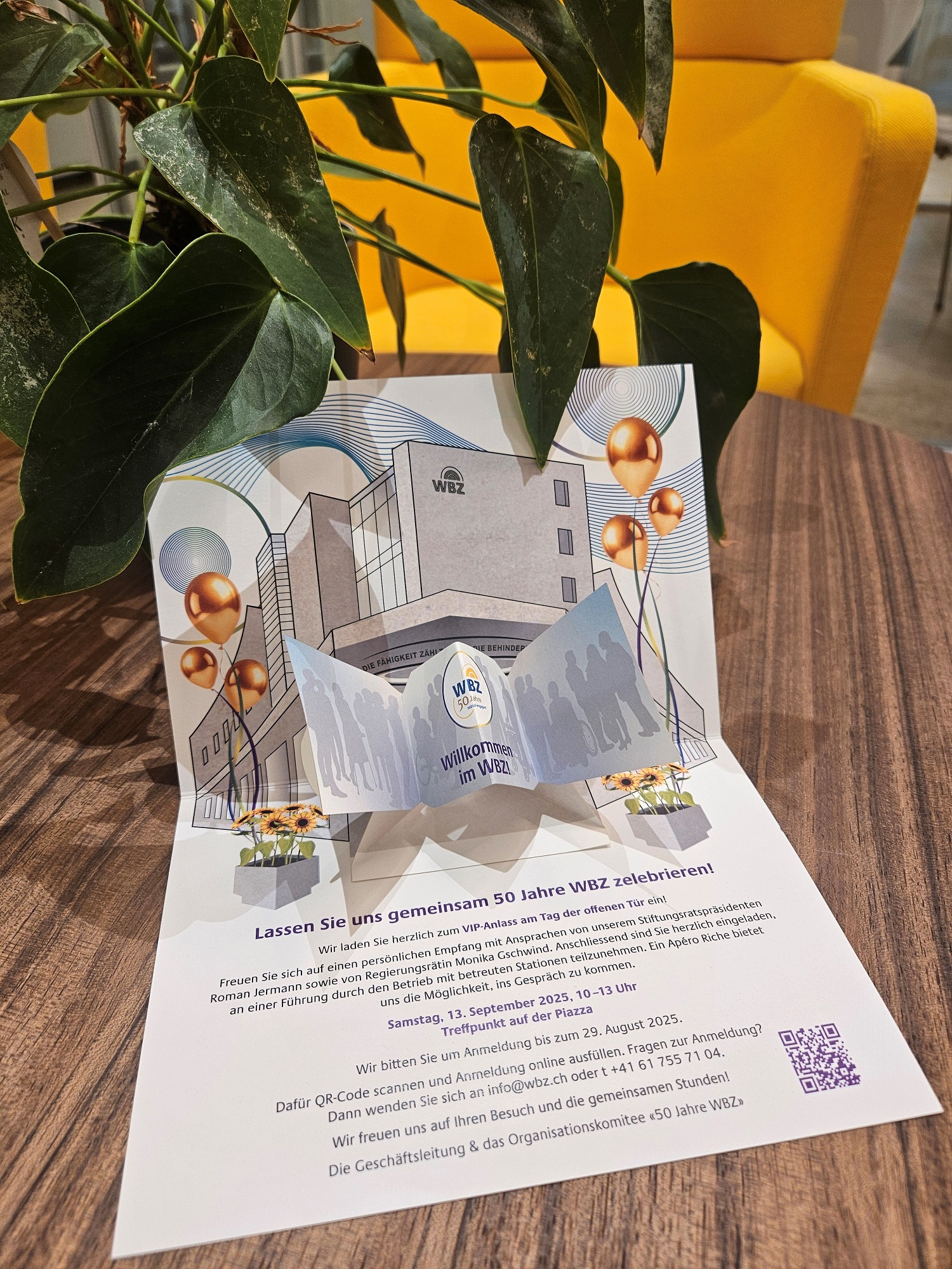 Wie die anderen Anlässe des Jubiläumsjahres wurde auch dieser - für den VIP-Anlass - mit einer im Haus gestalteten Karte beworben. Die Gestaltung der Karte entstand auch dieses Mal aus den kreativen Ideen des Grafischen Service-Zentrums. Anschliessend wurde sie gedruckt und von Menschen mit Behinderung einzeln zusammengeklebt, gefaltet und in Kuverts gebracht. Dies zeigt einmal mehr die Kompetenz und Vielseitigkeit der WBZ-Dienstleistungen und hat einen weiteren Auftrag an Menschen mit Behinderung ermöglicht. (lpe)
